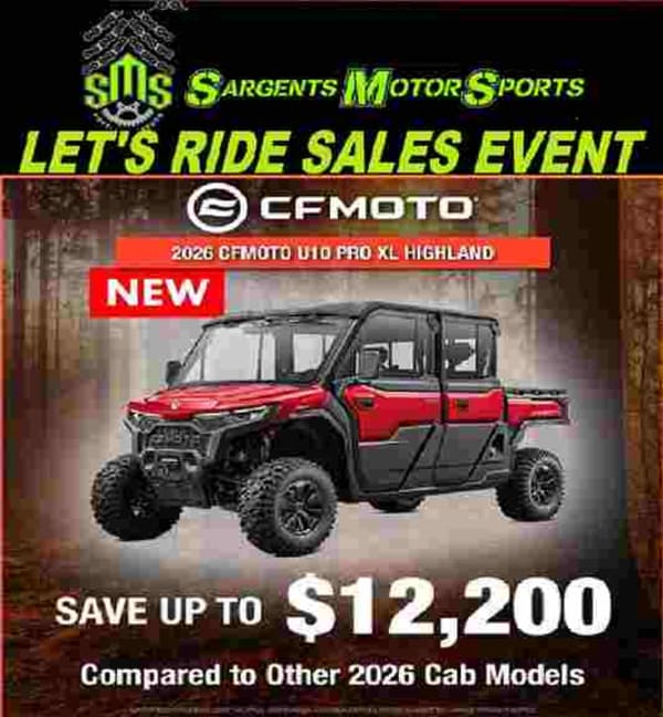 WE WILL BE SHOWING THE NEW 2026 CFMOTO U10 PRO HIGHLAND UTV, EQUIPPED WITH A FULLY ENCLOSED CAB WITH AIR CONDITIONING, HIGH OUTPUT HEATER, APPLE CAR PLAY TOUCH SCREEN DISPLAY, POWER WINDOWS, POWER DUMP BED, POWER TIP OUT WINDSHIELD, 4500LB WINCH, ALL